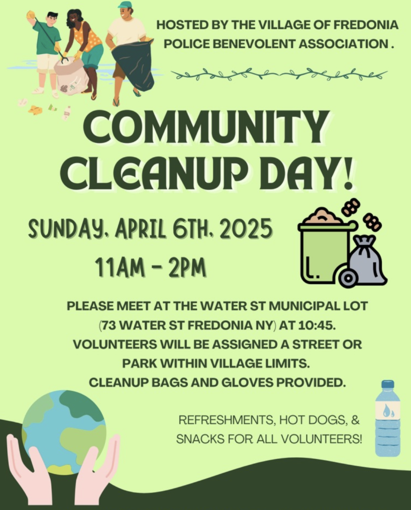 Community Cleanup Day! hosted by the Village of Fredonia Police Benevolent Association on Sunday, April 6th, 2025, from 11 AM – 2 PM. Volunteers should meet at the Water St. Municipal Lot (73 Water St, Fredonia, NY) at 10:45 AM and will be assigned a street or park within the village limits to help clean up. Cleanup bags and gloves will be provided, and all volunteers will be treated to refreshments, hot dogs, and snacks as a thank-you for their efforts. It’s a great way to give back, enjoy the outdoors, and keep the community looking its best!